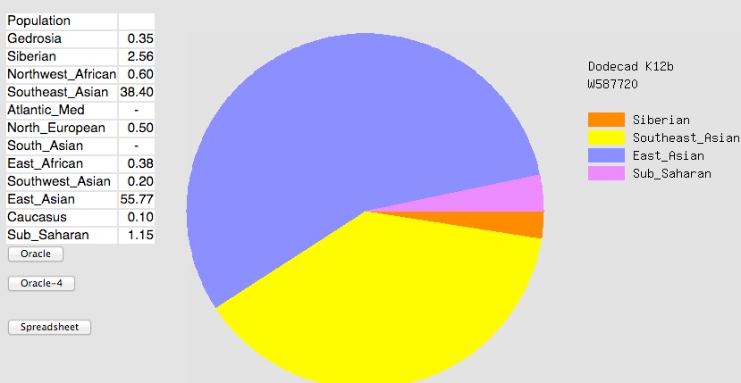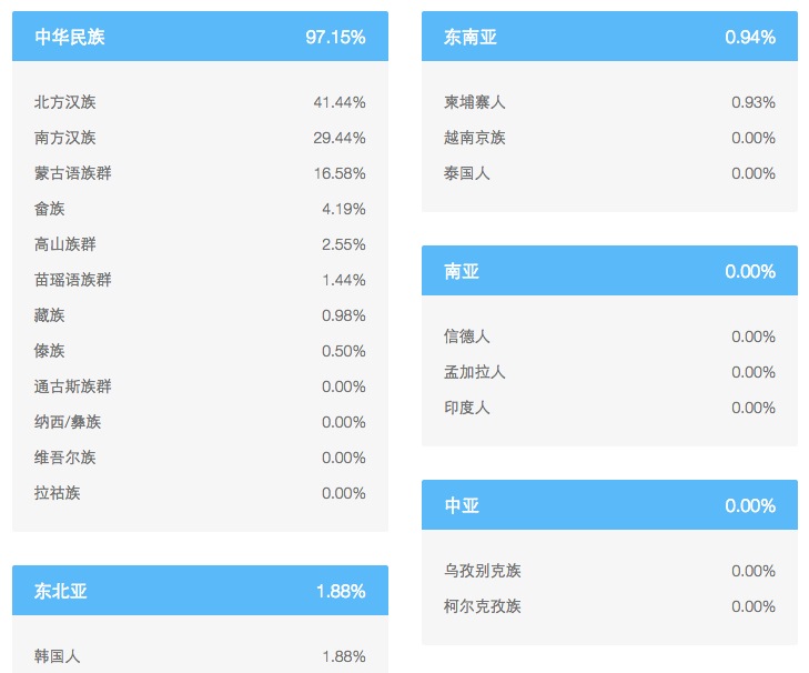 建议您去分开测试您父母的然后看看三人的k12b之类对比,我猜测您和我一样,父系是比较平均的汉族水平,但有很多其他很细小的成分可能是来源于母系。