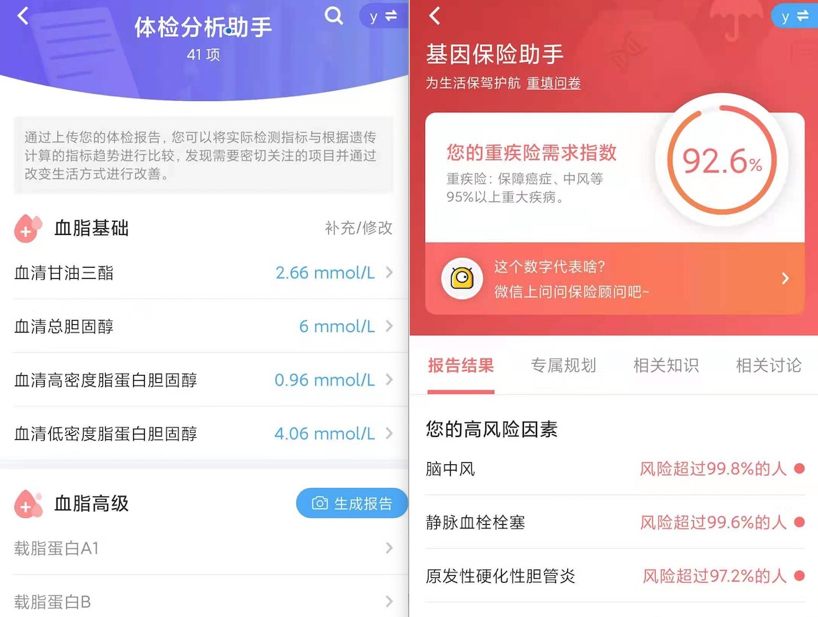 除了基础的检测报告,WeGene 还提供了基因「体检助手」和「保险助手」。