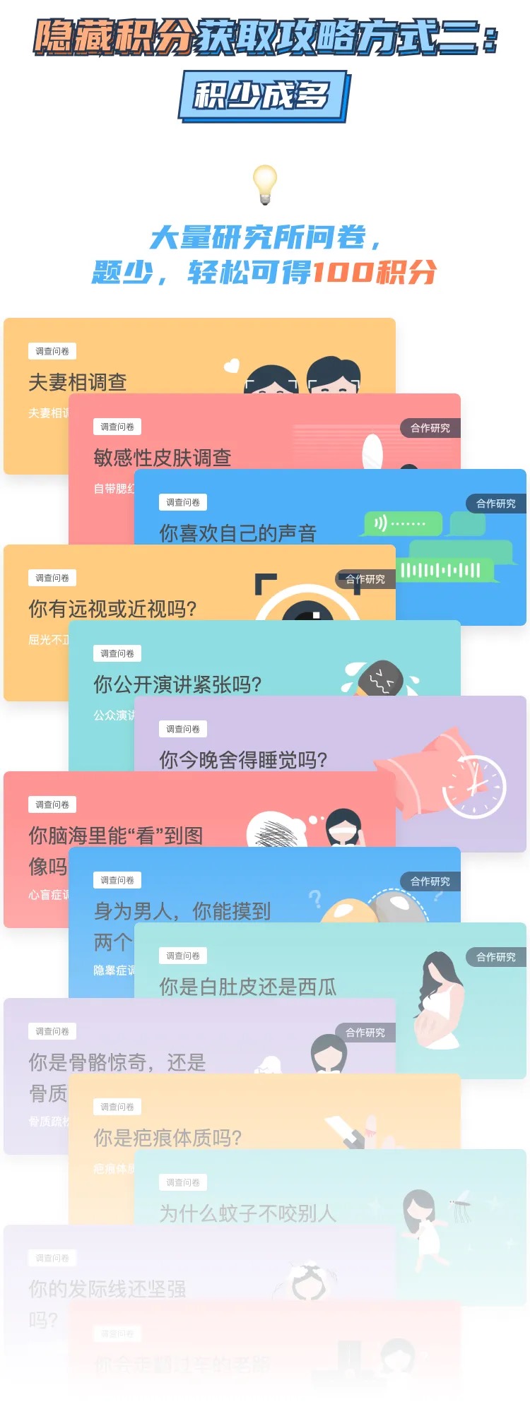 在完成了上面的高分问卷后,大家还可以积少成多,随手完成一些其他轻松的问卷;短短几分钟,能赚分也能完善自己的报告!
