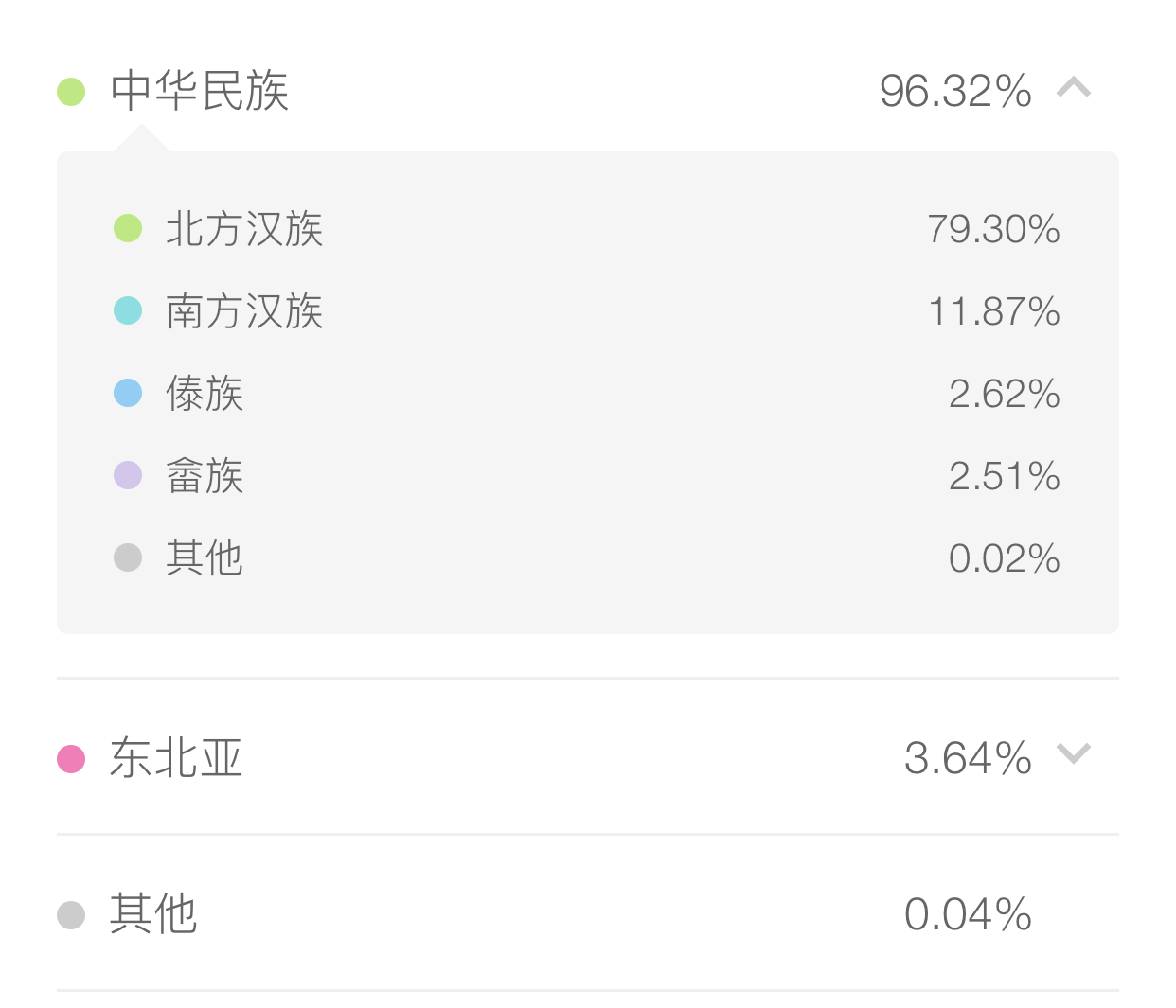 我是百分之74的北方汉族 20多的南方汉族有其它少数民族。